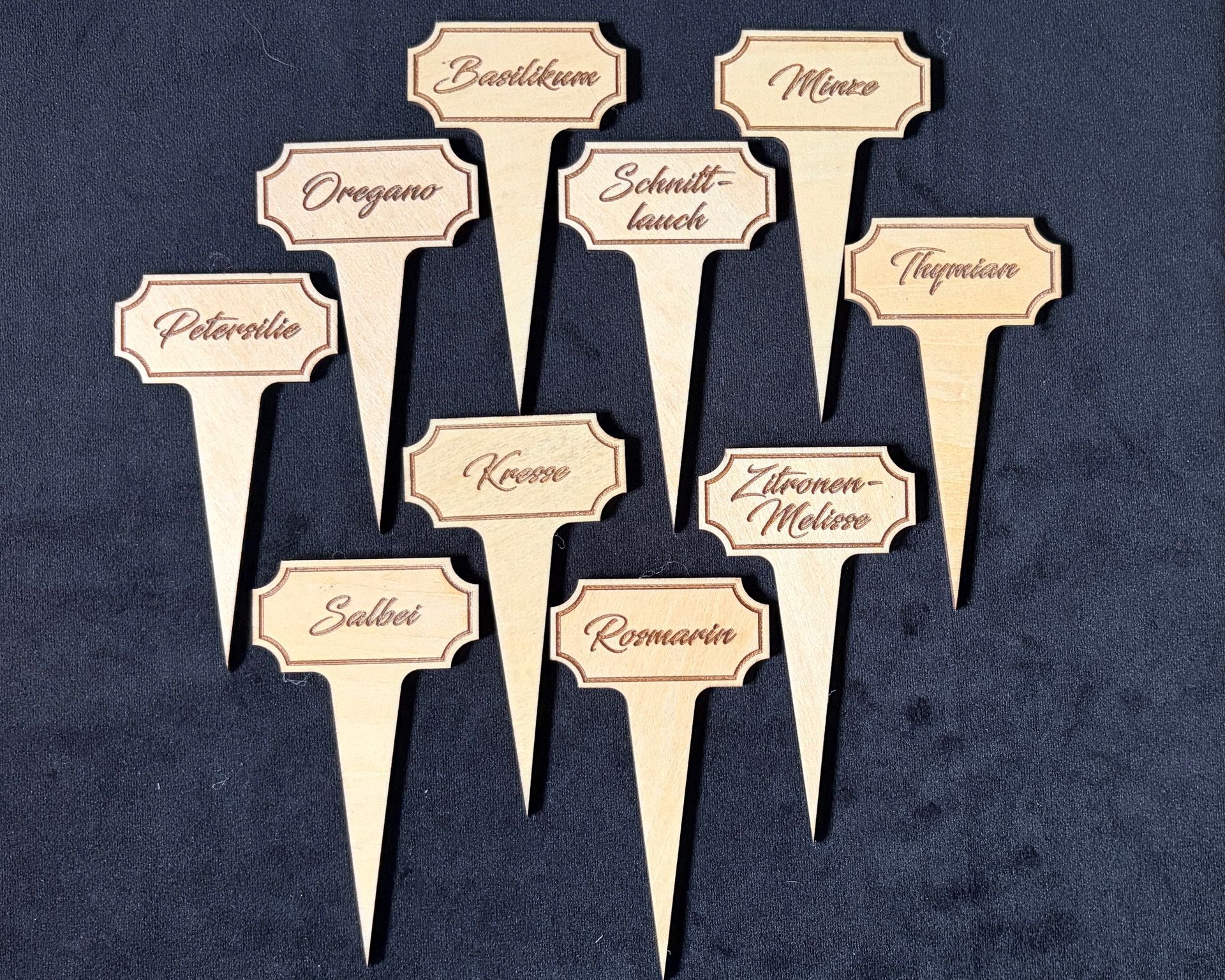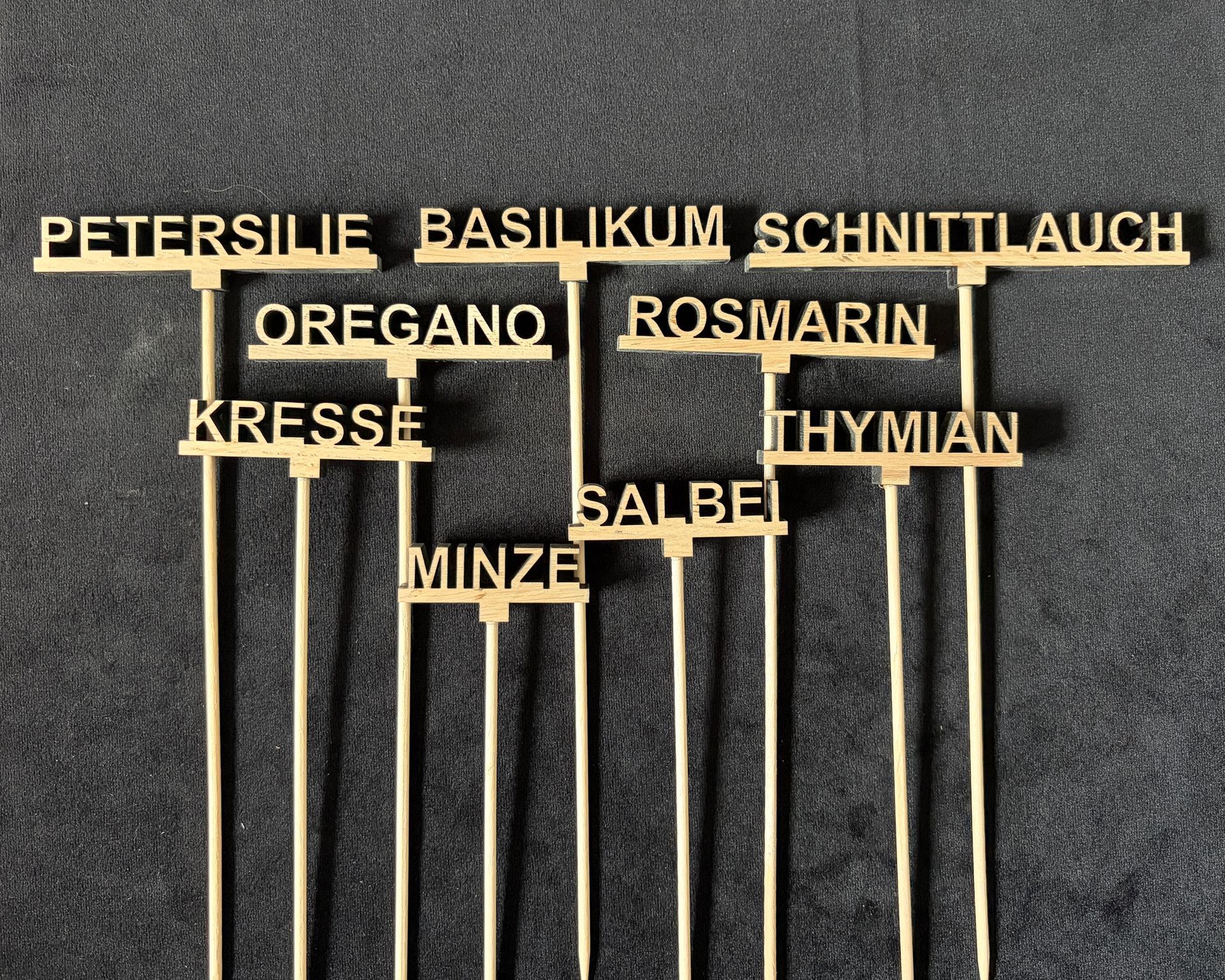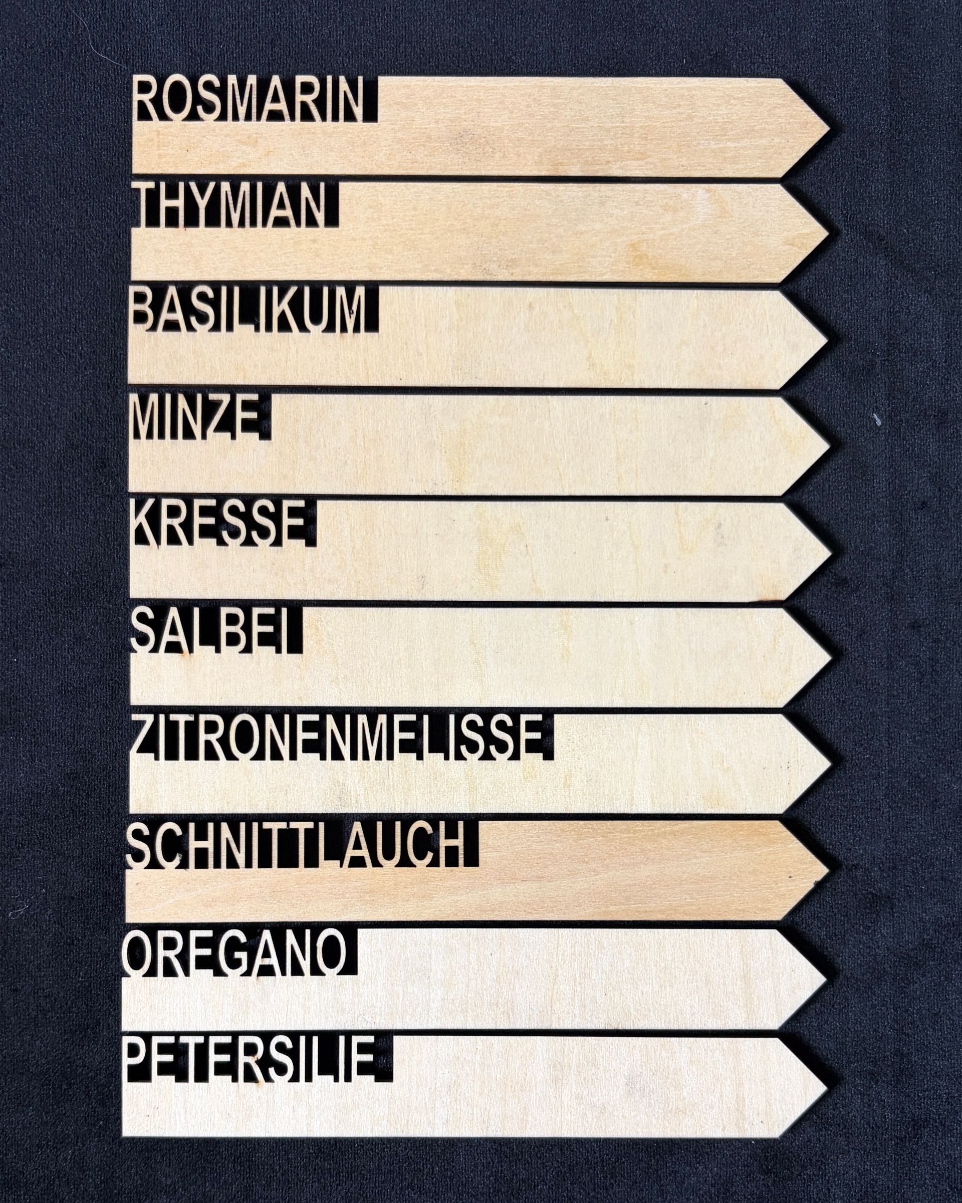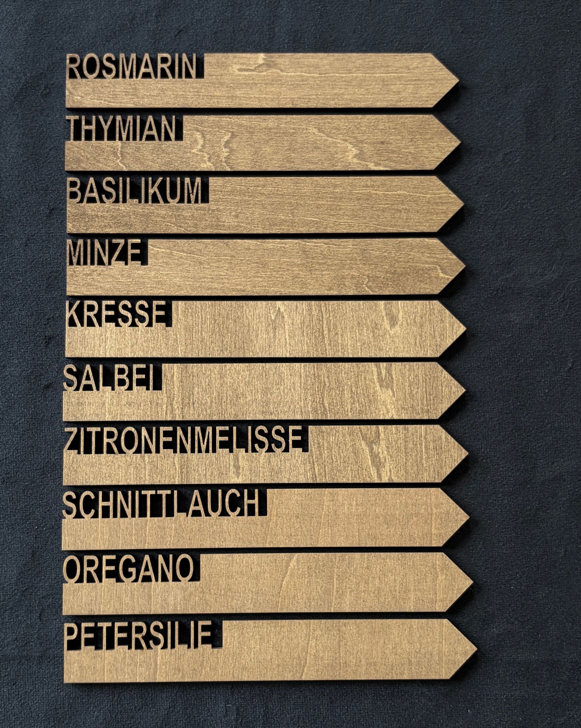 Breite: 5cm (Minze) bis 12cm (Schnittlauch), Höhe der Schrift 1,5cm